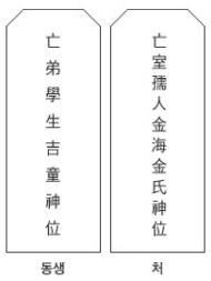 고인의 이름의 경우에는 남자는 모두 '부군'이라고 쓰고 여자의 경우에는 본관과 성씨만 씁니다. 동생이나 자식은 성을 빼고 이름만 적습니다.
