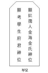 ✔ 부모 두 분 모두 돌아가신 경우에는 지방에 부모를 같이 쓰는데, 오른쪽에 어머니 신위를, 왼쪽에 아버지 신위를 씁니다.