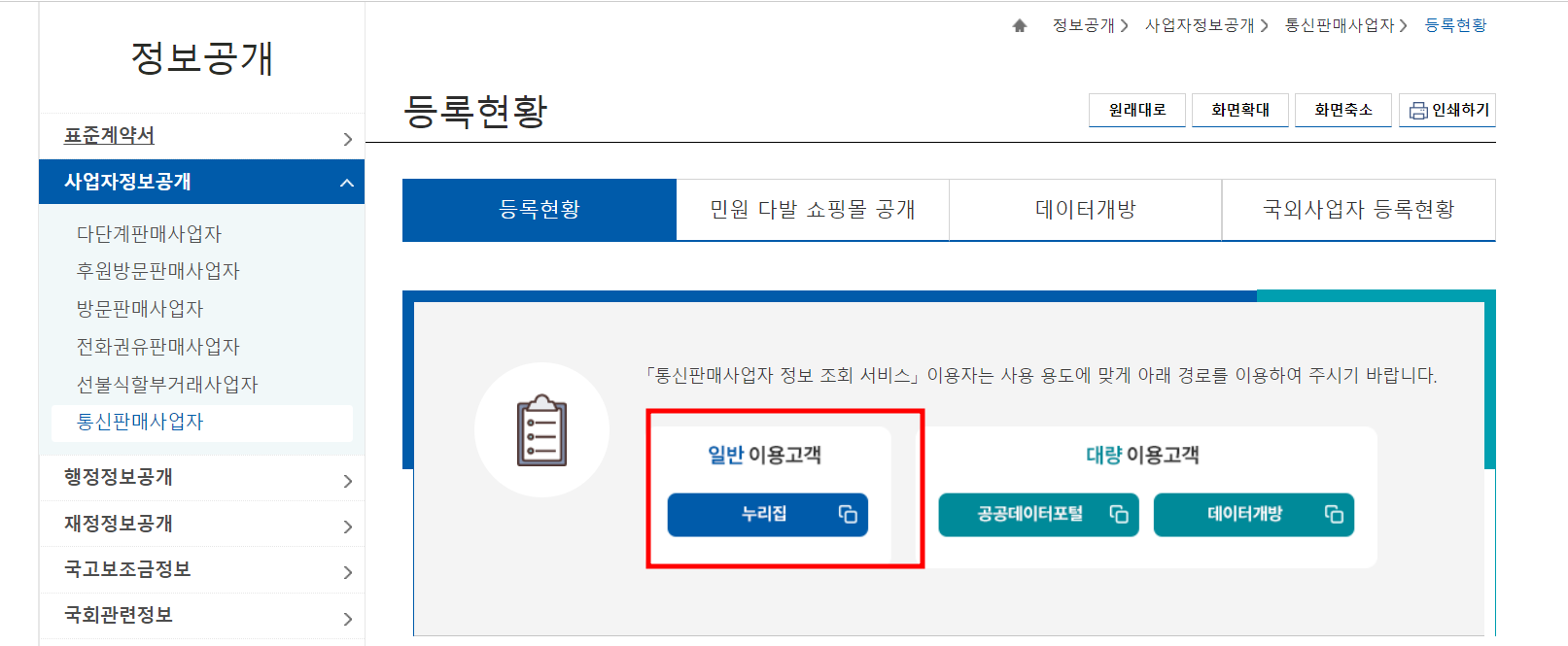 등록현황에서 일반이용고객 누리집을 클릭합니다.