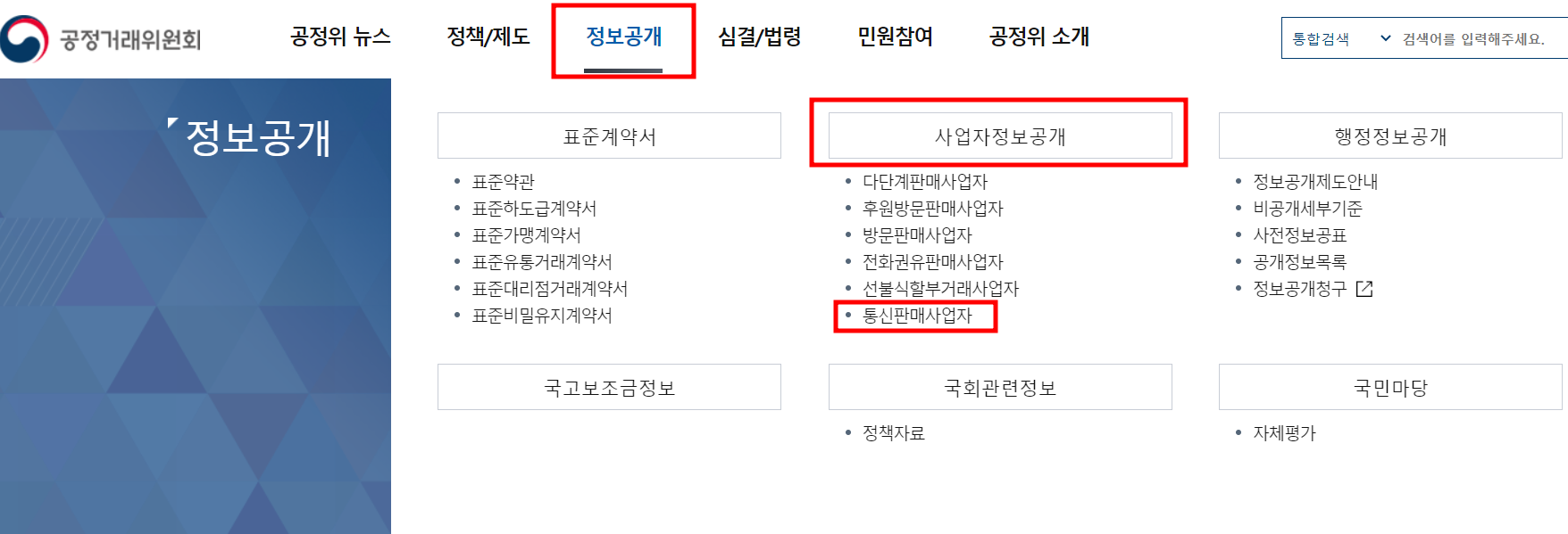 [정보공개]메뉴에서 [사업자정보공개]-[통신판매사업자]를 클릭합니다.