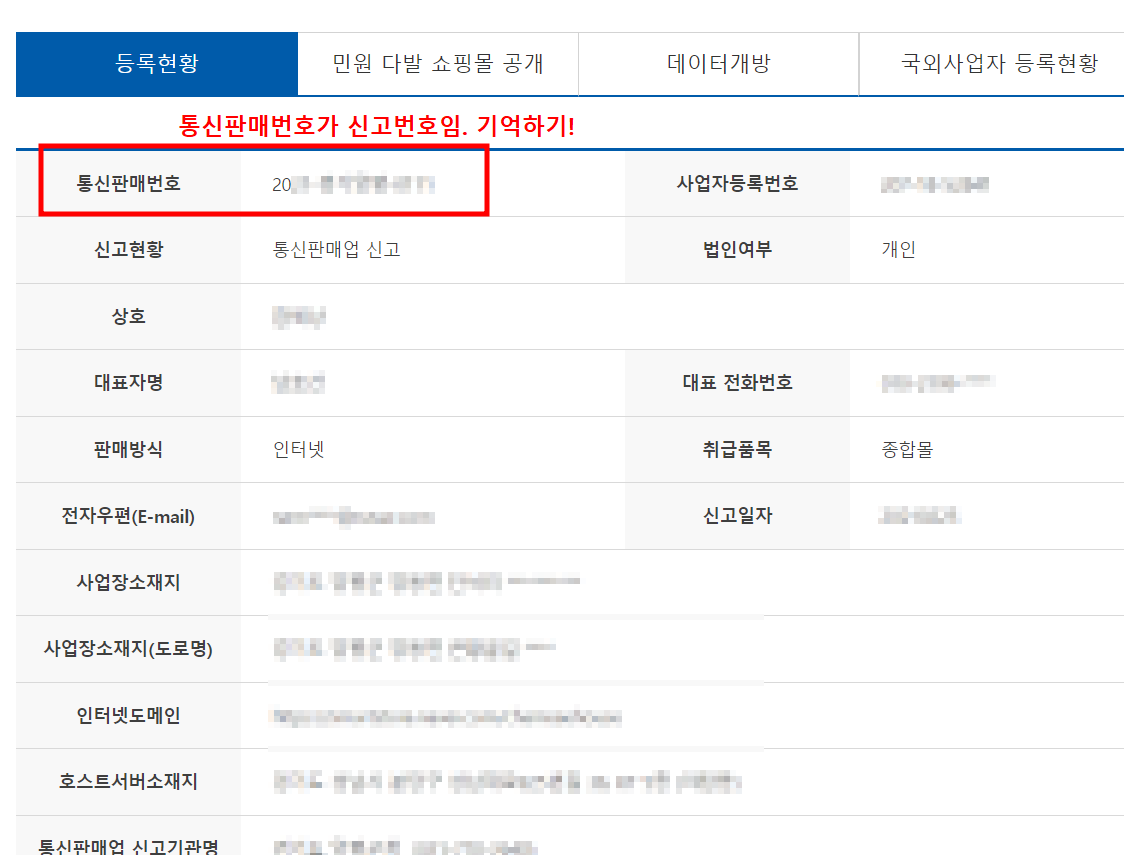 그러면 맨 위에 통신판매번호가 나옵니다.